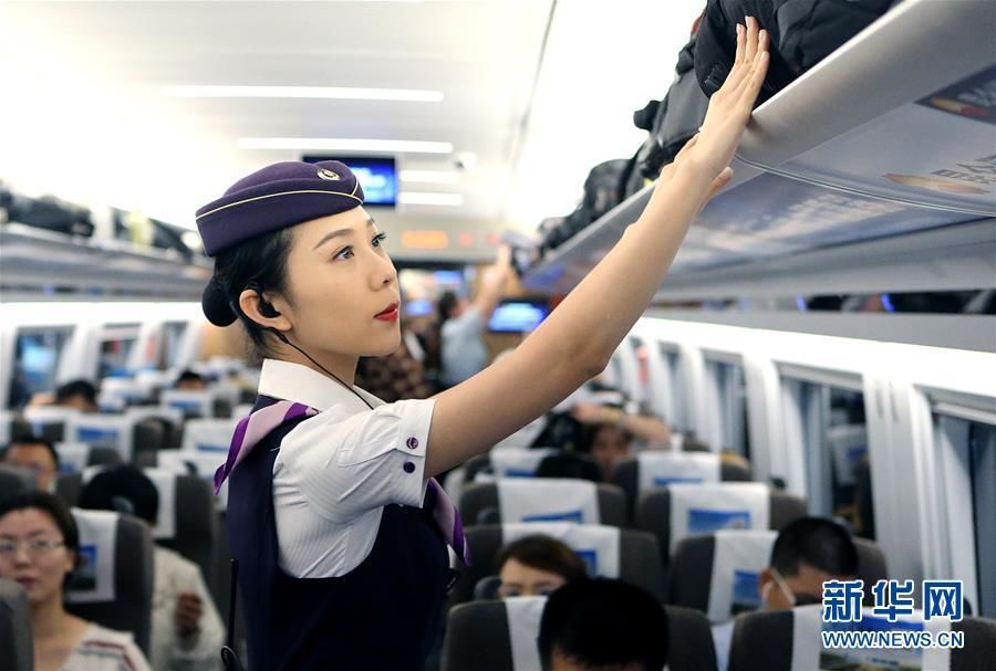 9月20日,换上新式制服的G2次列车乘务员在上海虹桥火车站准备出乘。 国庆前夕,由铁路上海客运段值乘的上海虹桥开往北京的G2次列车乘务员身着新式制服为旅客服务。 新华社记者 陈飞 摄
